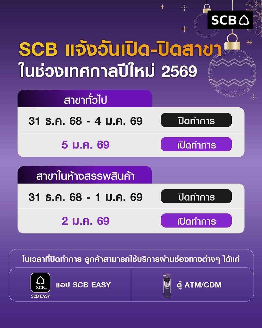 ธนาคารไทยพาณิชย์ ประกาศวันเปิด-ปิดทำการสาขา ช่วงเทศกาลปีใหม่ 2569 วันที่ 31 ธันวาคม 2568 ถึงวันที่ 5 มกราคม 2569 ดังนี้