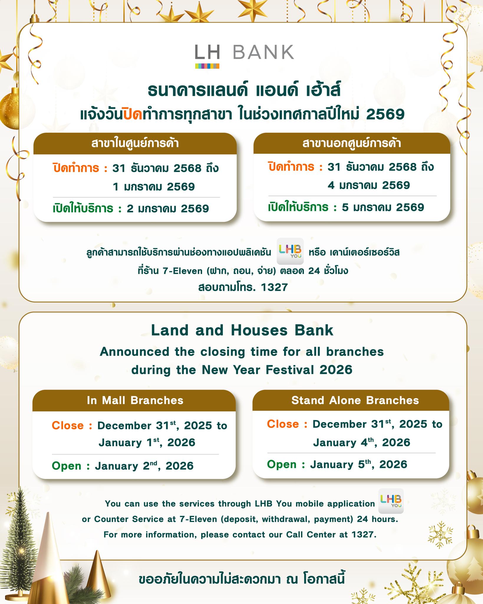 ธนาคารแลนด์ แอนด์ เฮ้าส์ แจ้งวันปิดทำการทุกสาขา ในช่วงเทศกาลปีใหม่ 2569 ดังนี้