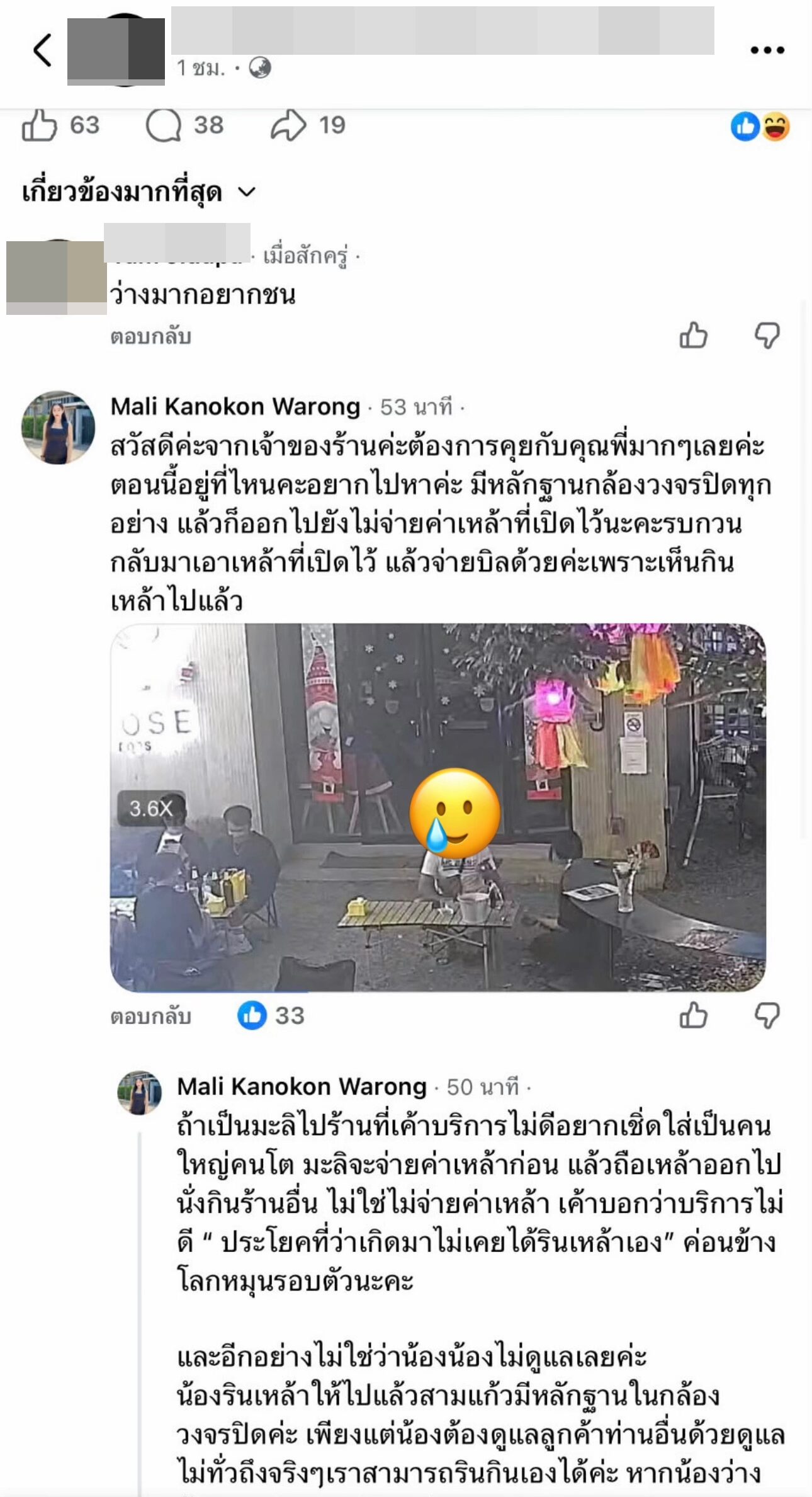 ต่อมา ชายคนดังกล่าว ได้โพสต์ในเพจหนึ่ง ต่อว่าทางร้าน เจ้าของร้านอาหารเห็นจึงเข้าไปคอมเมนต์ชี้แจง และให้กลับมาจ่ายเงินด้วย รวมทั้งบอกว่า ลูกค้าคนนี้พูดว่า เกิดมาไม่เคยต้องรินเหล้ากินเอง ซึ่งประโยคนี้รู้สึกว่าเกินไป และน้องที่ร้านก็ไม่ใช่ว่าไม่รินเหล้าให้ แต่รินให้ถึง 3 ครั้ง และยังต้องไปบริการลูกค้าโต๊ะอื่นอีกด้วย จึงอยากให้เข้ามาคุยแล้วจ่ายค่าบริการด้วย