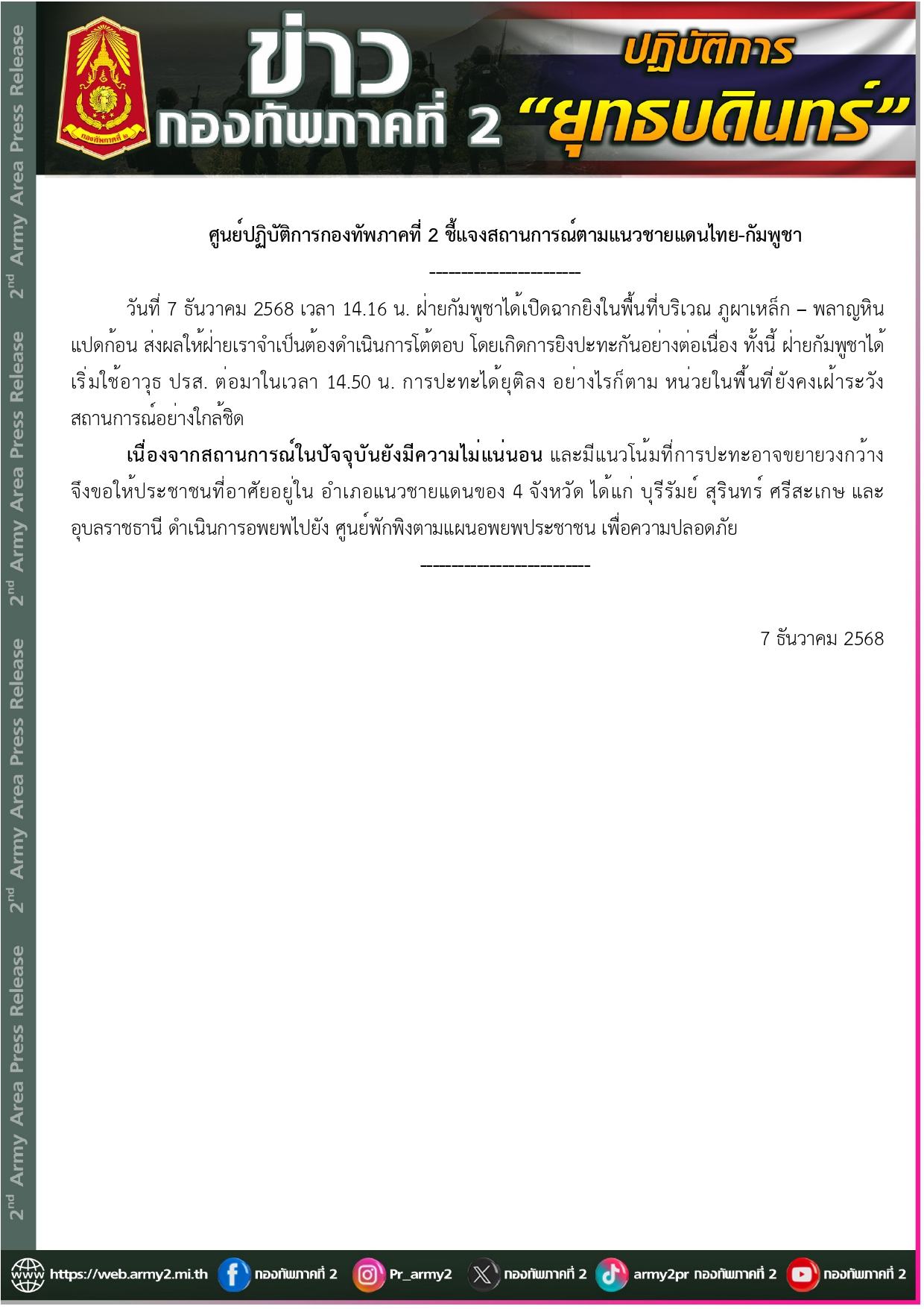 เมื่อวันที่ 7 ธันวาคม 2568 กองทัพภาคที่ 2 สรุปสถานการณ์ปะทะ-ภูผาเหล็ก-พลาญหินแปดก้อน จังหวัดศรีสะเกษ ดังต่อไปนี้