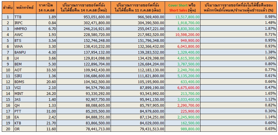 เปิด 20 อันดับหุ้นถูก “Cover-Short” สูงสุด ณ 14 ก.ค.68