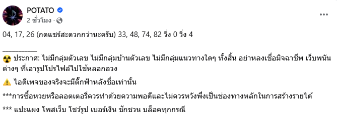 ล่าสุดก่อนหวยออกในช่วงโค้งสุดท้าย เพจPOTATO โพสต์ระบุว่า 04, 17, 26 (กดแชร์สะดวกกว่านะครับ) 33, 48, 74, 82 วิ่ง 0 วิ่ง 4