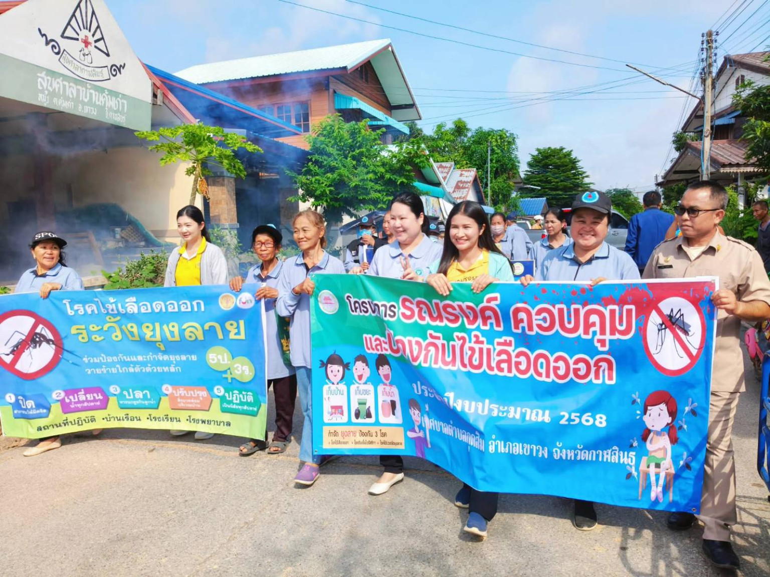 วันที่ 15 กรกฎาคม 2568 ผู้สื่อข่าวรายงานว่า นางสาววิภาวี บุญเรือง นายกเทศมนตรีตำบลกุดสิม อ.เขาวง จ.กาฬสินธุ์ พร้อมด้วยเจ้าหน้าที่กองสาธารณสุขเทศบาลตำบลกุดสิม ร่วมกับสาธารณสุขอำเภอเขาวง รพ.สต.ผู้นำชุมชน กำนัน ผู้ใหญ่บ้าน และอสม.ร่วมกันลงพื้นที่รณรงค์ และจัดโครงการรณรงค์ ควบคุม และป้องกันไข้เลือดออก ประจำปี 2568 ที่หมู่ 1 หมู่ 14 หมู่ 2 และ หมู่ที่ 18 ต.คุ้มเก่า พร้อมนำเจ้าหน้าที่ออกฉีดพ่นหมอกควันกำจัดยุงลาย และทำลายแหล่งเพาะพันธุ์ยุงลาย และจะดำเนินการออกปูพรมฉีดพ่นในพื้นที่ ต.กุดสิม ต.คุ้มเก่า ต.กุดสิมคุ้มใหม่ และต.กุดปลาค้าวรวม ทั้ง 25 หมู่บ้าน