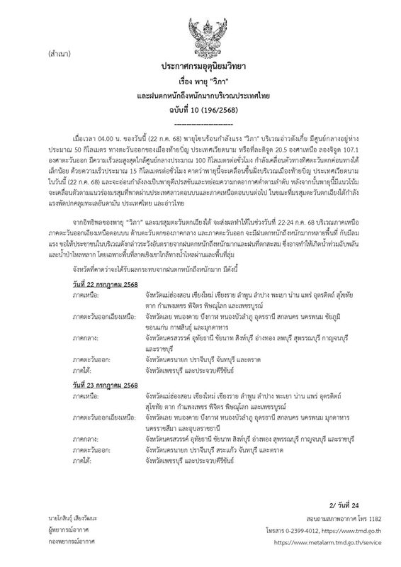 วันที่ 22 ก.ค.2568 กรมอุตุนิยมวิทยา ประกาศ เรื่อง พายุ "วิภา" และฝนตกหนักถึงหนักมากบริเวณประเทศไทย ฉบับที่ 10 (196/2568) ระบุว่า เมื่อเวลา 04.00 น. ของวันนี้ (22 ก.ค. 68) พายุโซนร้อนกำลังแรง "วิภา" บริเวณอ่าวตังเกี๋ย มีศูนย์กลางอยู่ห่างประมาณ 50 กิโลเมตร ทางตะวันออกของเมืองท้ายบิ่ญ ประเทศเวียดนาม หรือที่ละติจูด 20.5 องศาเหนือ ลองจิจูด 107.1 องศาตะวันออก