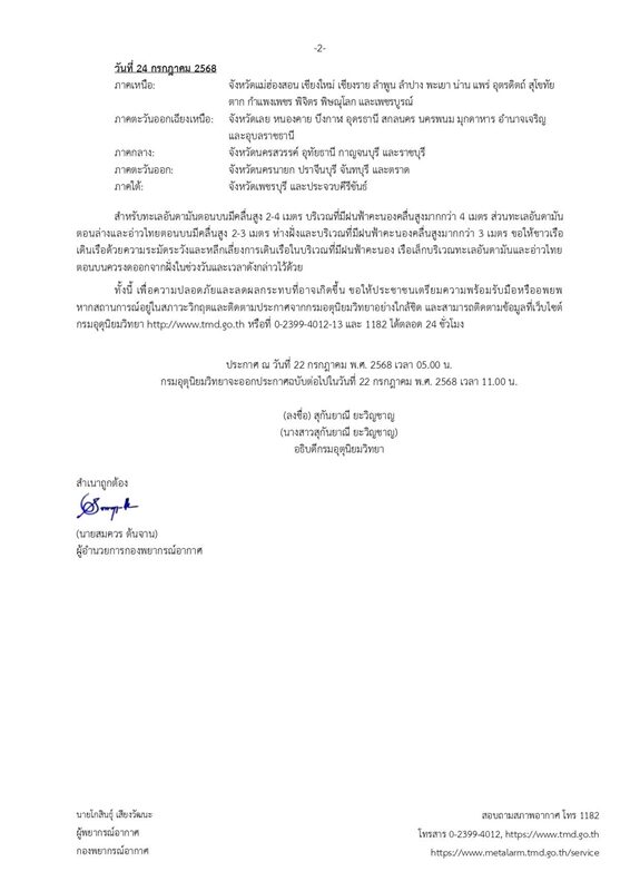 ประกาศ ณ วันที่ 22 กรกฎาคม พ.ศ. 2568 เวลา 05.00 น. ทั้งนี้ กรมอุตุนิยมวิทยาจะออกประกาศฉบับต่อไปในวันที่ 22 กรกฎาคม พ.ศ. 2568 เวลา 11.00 น.