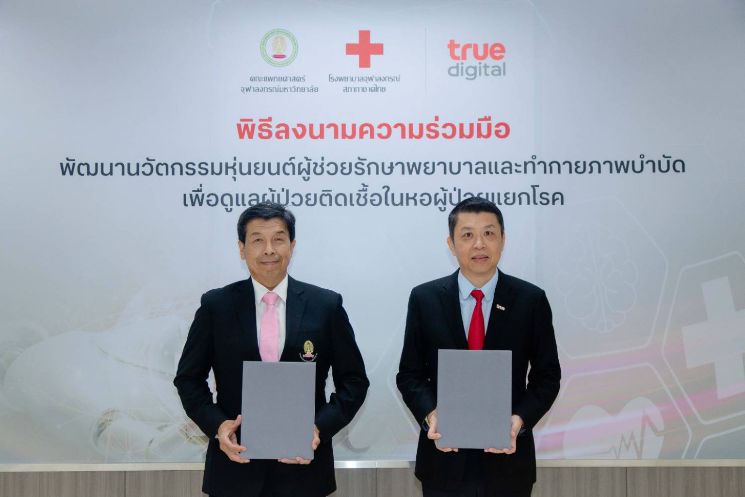 รศ.นพ.ฉันชาย สิทธิพันธุ์ ผู้อำนวยการ โรงพยาบาลจุฬาลงกรณ์ สภากาชาดไทย และคณบดี คณะแพทยศาสตร์ จุฬาลงกรณ์มหาวิทยาลัย ลงนามความร่วมมือกับ บริษัท ทรู ดิจิทัล กรุ๊ป จำกัด โดย นายเอกราช ปัญจวีณิน หัวหน้าคณะผู้บริหารด้านดิจิทัล และ (รักษาการ) หัวหน้าคณะผู้บริหารด้านกลุ่มธุรกิจองค์กร บมจ. ทรู คอร์ปอเรชั่น พร้อมด้วย นายณัฐวุฒิ อมรวิวัฒน์ กรรมการบริหาร บมจ.ทรู คอร์ปอเรชั่น และ ประธานกรรมการ บริษัท ทรู ดิจิทัล กรุ๊ป จำกัด เพื่อพัฒนานวัตกรรม “หุ่นยนต์ผู้ช่วยรักษาพยาบาลและทำกายภาพบำบัด” ที่จะเป็นเสมือนหนึ่งในทีมบุคลากรการแพทย์ช่วยดูแลและให้บริการผู้ป่วยติดเชื้อที่อยู่ในระยะให้ยาและรักษาในห้องแยกโรค เพื่อป้องกันการแพร่เชื้อ ยกระดับบริการทางการแพทย์และการรักษาพยาบาลที่เป็นเลิศและเป็นต้นแบบเพื่อสร้างเสริมสังคมสู่การพัฒนาอย่างยั่งยืน (Innovation for society)