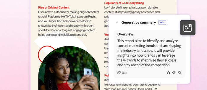 ยกระดับการทำงานร่วมกันในเอกสารด้วยการรีวิวจาก AI: การทำงานร่วมกันแบบดิจิทัลคือวิธีการทำงานตั้งแต่แบบร่างไปจนถึงเสร็จสิ้น และด้วยจำนวนเอกสารที่เพิ่มขึ้น 75% ต่อปี การทำงานร่วมกันจึงเกิดขึ้นใน Acrobat มากกว่าที่เคยเป็นมา Generative AI จะทำให้กระบวนการมำงานร่วมกันง่ายขึ้น รวมถึงวิเคราะห์คำติชม และความคิดเห็น แนะนำการเปลี่ยนแปลง หรือแม้แต่ช่วยแก้ไขข้อเสนอแนะที่ขัดแย้งกัน