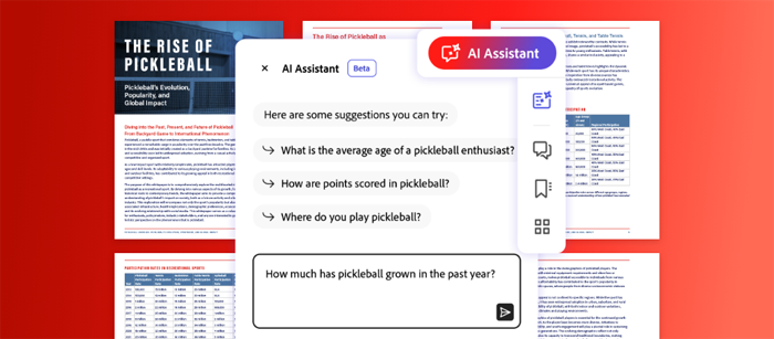 AI Assistant ใน Reader และ Acrobat สามารถแปลงเอกสารยาวๆ และข้อมูลปริมาณมากให้เป็นข้อมูลเชิงลึกที่เป็นประโยชน์และเนื้อหาที่เข้าใจง่ายและนำไปใช้ได้จริง วันนี้ผู้จัดการโครงการสามารถสแกน สรุป และแชร์ไฮไลท์การประชุมได้ภายในไม่กี่วินาที ทีมขายสามารถนำเสนอสินค้าได้แบบ personalized และตอบคำถามลูกค้าได้เพียงไม่กี่นาที นักเรียนสามารถลดเวลาที่ใช้ค้นคว้าข้อมูลในการทำวิจัยและใช้เวลามากขึ้นในการวิเคราะห์ข้อมูลเชิงลึก ทีมโซเชียลมีเดียและการตลาดสามารถมองหาเทรนด์และประเด็นสำคัญได้อย่างรวดเร็วเพื่ออัพเดทลูกค้า AI Assistant ลดเวลาในการเขียนอีเมลหรือการพิจารณาสัญญาต่างๆ โดยส่งมอบประสิทธิภาพการทำงานให้กับผู้ปฏิบัติงานที่มีความรู้และผู้ใช้ทุกที่ คลิกที่นี่ เพื่อดูว่าผู้คนใช้ AI Assistant เพื่อประหยัดเวลาและได้รับข้อมูลเชิงลึกเร็วขึ้นได้อย่างไร