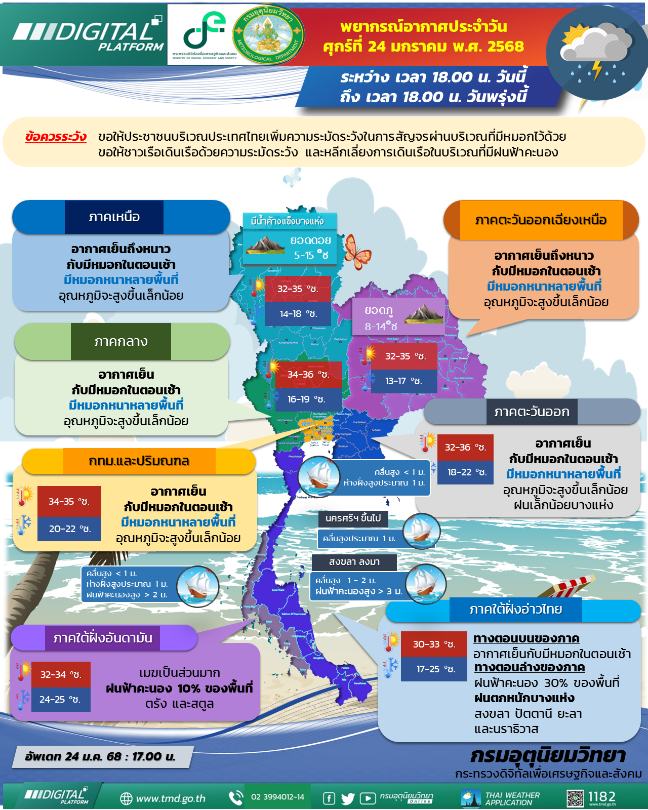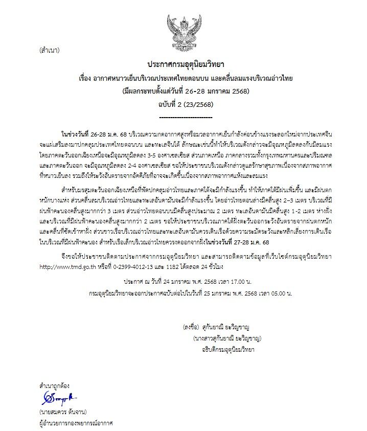 เมื่อเวลา 17.00 น. วันที่ 24 ม.ค.2568 กรมอุตุนิยมวิทยา ประกาศเรื่อง อากาศหนาวเย็นบริเวณประเทศไทยตอนบน และคลื่นลมแรงบริเวณอ่าวไทย (มีผลกระทบตั้งแต่วันที่ 26-28มกราคม 2568) ฉบับที่ 2 (23/2568)