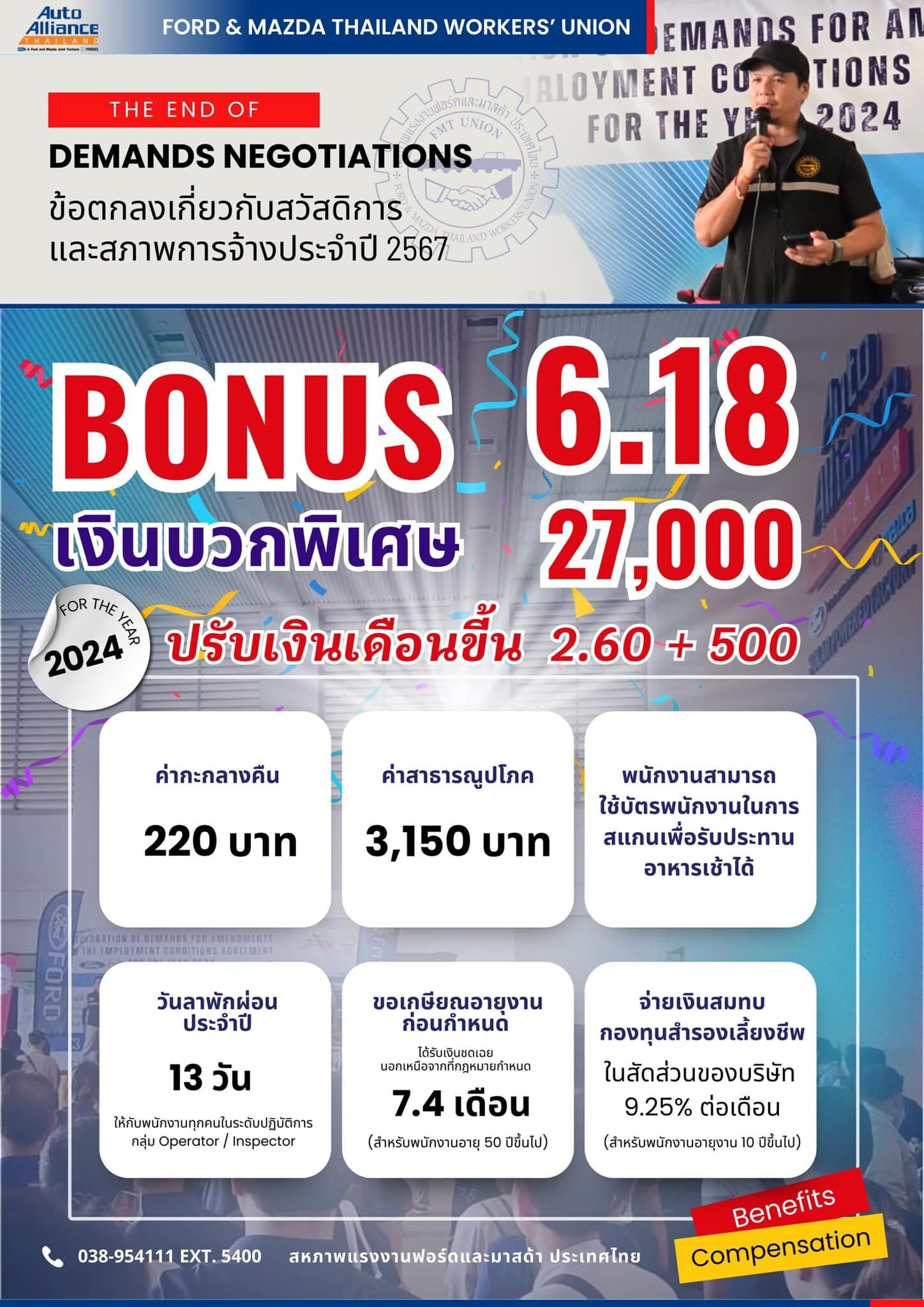 เมื่อวันที่ 22 พ.ย.67 ผู้สื่อข่าวรายงานว่า เฟซบุ๊ก สหภาพแรงงาน ฟอร์ดและมาสด้า ประกาศเปิดเผยโบนัสของ บริษัท ออโต้อัลลายแอนซ์ (ประเทศไทย) จำกัด ระบุว่า “สำหรับพนักงานของบริษัทออโต้อัลลายแอนซ์ (ประเทศไทย) จำกัด โดยมีรายละเอียดดังนี้ค่ะ โบนัส 6.18 เท่าของเงินเดือน พร้อมเงินบวกพิเศษ 27,000 บาท