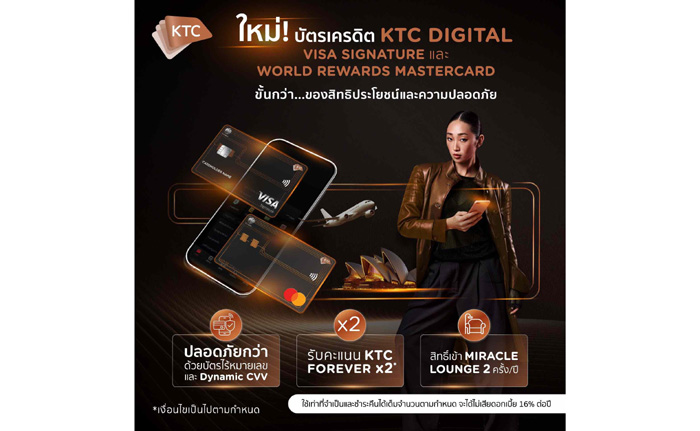 สำหรับบัตรเครดิตเคทีซี ดิจิทัล วีซ่า ซิกเนเจอร์และบัตรเครดิตเคทีซี ดิจิทัล เวิลด์ รีวอร์ดส มาสเตอร์การ์ด ยังมาพร้อมจุดเด่นที่ตอบโจทย์ไลฟ์สไตล์สมาชิกด้วยสิทธิพิเศษ อาทิ รับคะแนน KTC FOREVER 2 เท่า เมื่อใช้จ่ายเป็นสกุลเงินต่างประเทศ (ยกเว้น 31 ประเทศในเขตเศรษฐกิจยุโรป และสาธารณรัฐประชาชนจีน) และรับสิทธิ์เข้าใช้ห้องรับรองพิเศษ MIRACLE LOUNGE ภายในสนามบินสุวรรณภูมิ 2 ครั้ง / ปี เมื่อแสดงบัตรเครดิตเคทีซี ดิจิทัล วีซ่า ซิกเนเจอร์ หรือ บัตรเครดิตเคทีซี ดิจิทัล เวิลด์ รีวอร์ดส มาสเตอร์การ์ด พร้อมบัตรโดยสารระหว่างประเทศของสายการบินไทย