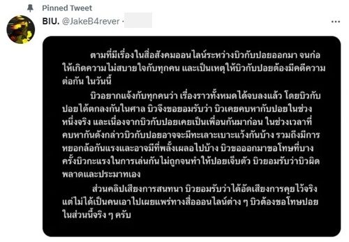 ส่วนคลิปเสียงการสนทนา บิวยอมรับว่าได้อัดเสียงการคุยไว้จริง แต่ไม่ได้เป็นคนเอาไปเผยแพร่ทางสื่อออนไลน์ต่าง ๆ บิวต้องขอโทษปอยในส่วนนี้จริง ๆ ครับ"