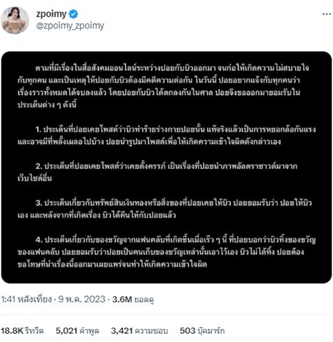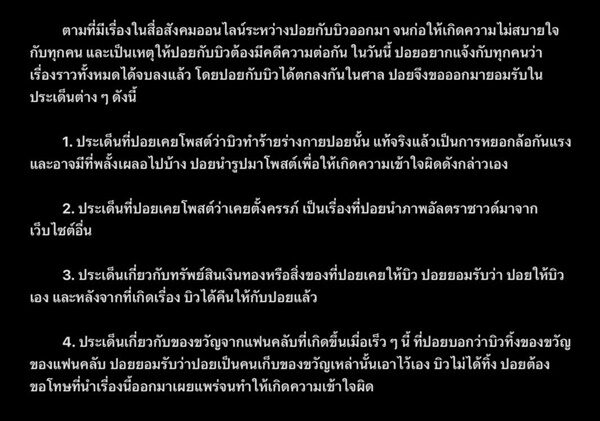 ปอยอยากแจ้งกับทุกคนว่า เรื่องราวทั้งหมดได้จบลงแล้ว โดยปอยกับบิวได้ตกลงกันในศาล ปอยจึงขอออกมายอมรับในประเด็นต่าง ๆ ดังนี้