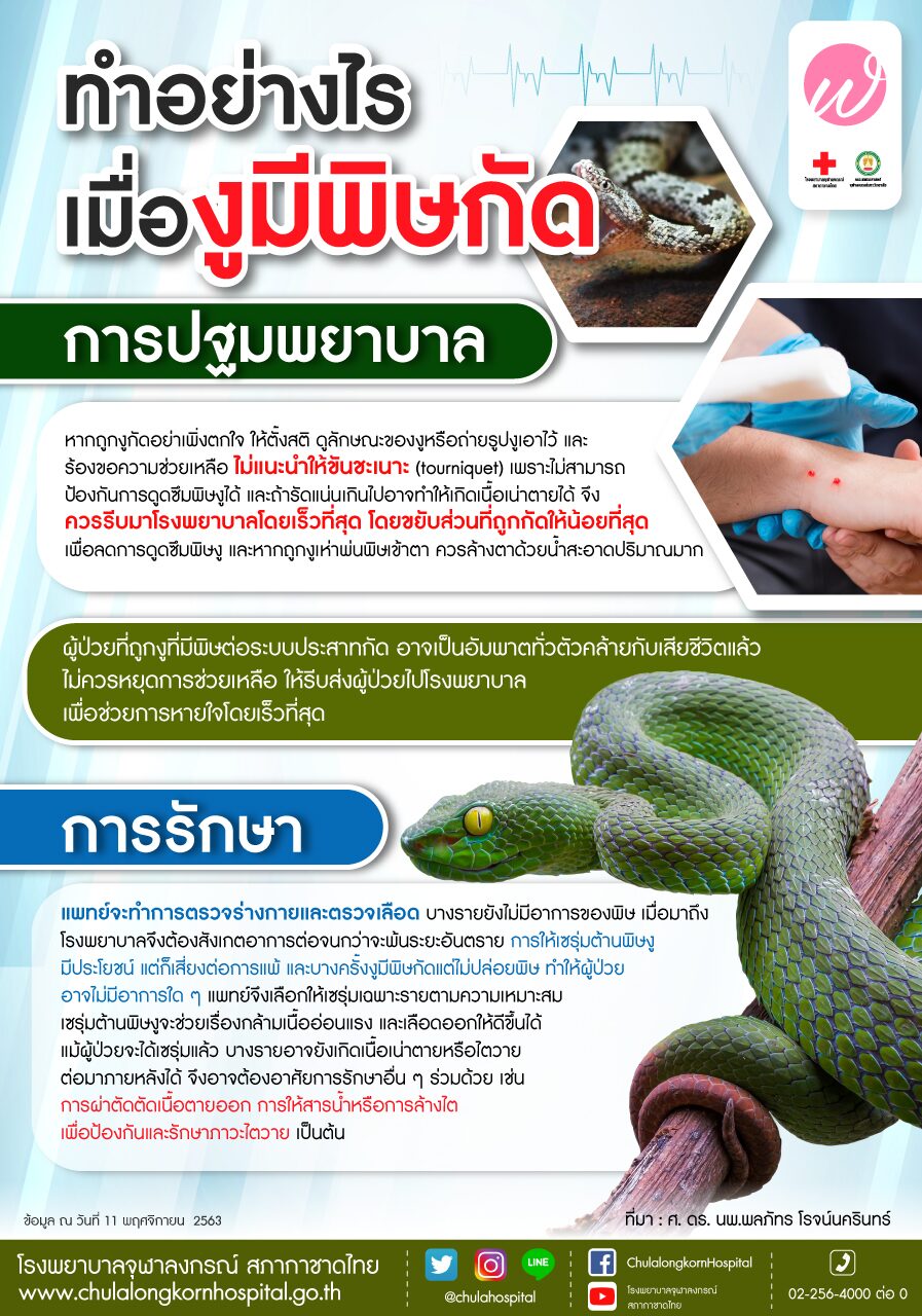 ข้อมูลจาก'โรงพยาบาลจุฬาลงกรณ์ สภากาชาดไทย' เผยว่า หากถูกงูกัด ตั้งสติ ดูลักษณะของงูหรือถ่ายรูปงูเอาไว้ ไม่แนะนำให้อับชะเนาะ (tourniquet) เพราะไม่สามารถป้องกันการดูดซึมพิษงูได้ และถ้ารัดแน่นเกินไปอาจทำให้เกิดเนื้อเน่าตายได้ จึงควรรีบมาโรงพยาบาลโดยเร็วที่สุด โดยขยับส่วนที่ถูกกัดให้น้อยที่สุด เพื่อลดการดูดซึมพิษงู และหากถูกงูหาพ่นพิษเข้าตา ควรล้างตาด้วยน้ำสะอาดปริมาณมาก