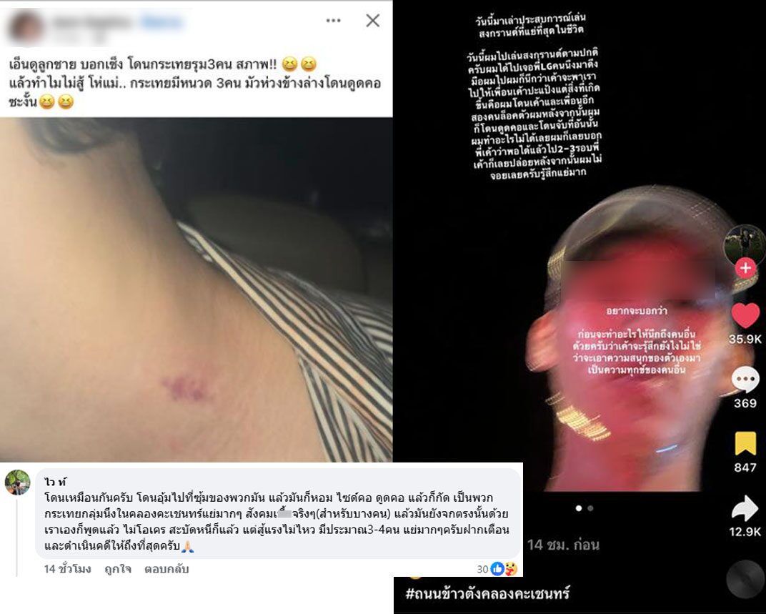 หนุ่มโร่เอาผิด แก๊งกะเทย รุมล้วงเป้า-ดูดคอช้ำ สงกรานต์ถนนข้าวตัง ตร.เผยรู้ตัวแล้วทั้ง 4 คน แห่คอมเมนต์มีผู้ชายไปเล่นน้ำโดนกันหลายคน