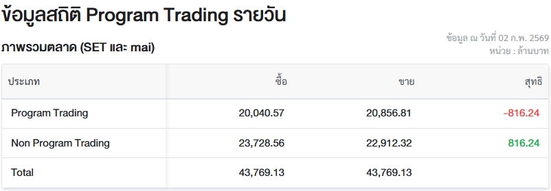 ผู้สื่อข่าวรายงานว่า วันนี้ (2 ก.พ.69) ตลาดหลักทรัพย์แห่งประเทศไทย (ตลท.) เปิดเผยข้อมูลซื้อขายรายวันผ่าน Program Trading หรือ “โปรแกรมโรบอทเทรดดิ้ง” พบว่ามีมูลค่าซื้อจำนวน 20,040.57 ล้านบาท และมูลค่าขายจำนวน 20,856.81 ล้านบาท เท่ากับขายสุทธิ 816.24 ล้านบาท