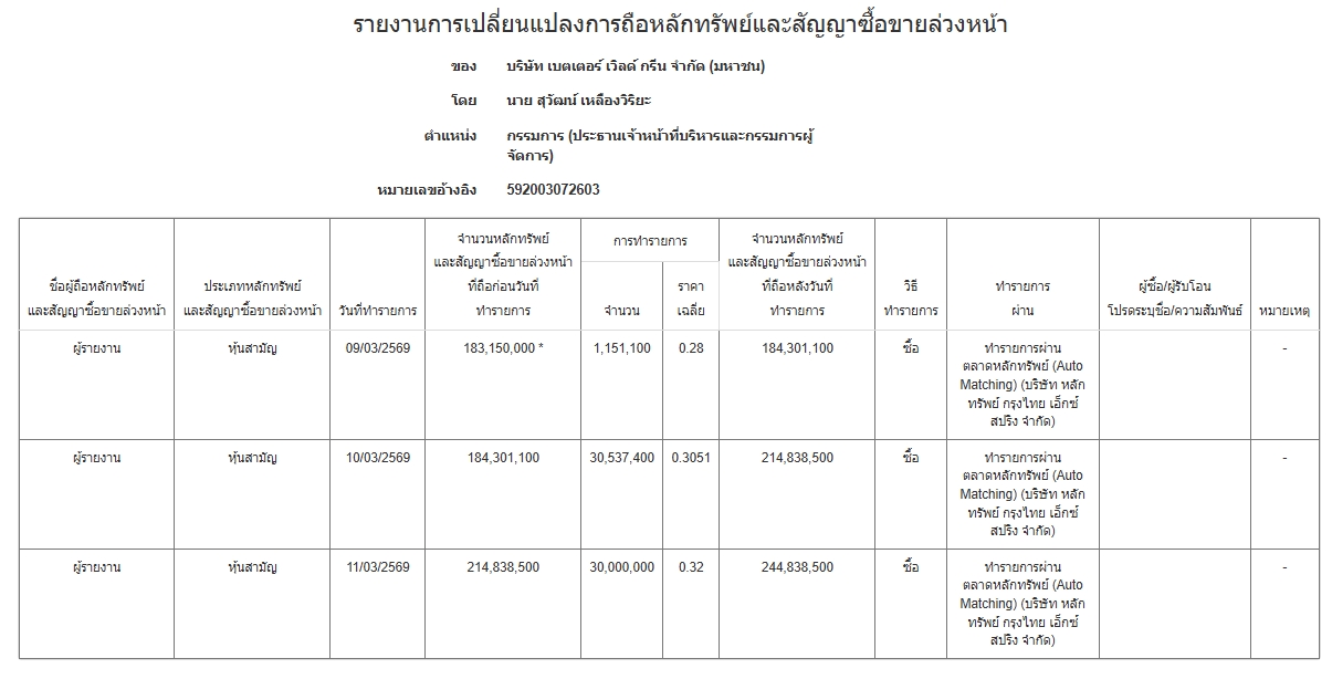 อัพเดต 13 มี.ค. เวลา 02.15 น. • เผยแพร่ 12 มี.ค. เวลา 14.00 น. • ข่าวหุ้นธุรกิจออนไลน์ผู้สื่อข่าวรายงานว่า สำนักงานคณะกรรมการกำกับหลักทรัพย์และตลาดหลักทรัพย์ (ก.ล.ต.) เปิดเผยข้อมูลจากแบบรายงานการเปลี่ยนแปลงการถือหลักทรัพย์และสัญญาซื้อขายล่วงหน้าของผู้บริหาร (แบบ 59) ประจำวันที่ 12 มีนาคม 2569 ระบุว่า สุวัฒน์ เหลืองวิริยะ กรรมการ ประธานเจ้าหน้าที่บริหาร และกรรมการผู้จัดการของ บริษัท เบตเตอร์ เวิลด์ กรีน จำกัด (มหาชน) หรือ BWG ได้ทำรายการทยอยเข้าซื้อหุ้นสามัญของบริษัทผ่าน บริษัทหลักทรัพย์ กรุงไทย เอ็กซ์สปริง จำกัด ระหว่างวันที่ 9–11 มีนาคม 2569