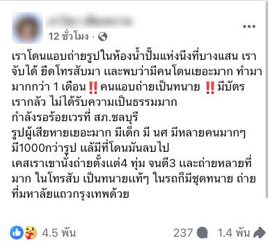 โดยสมาชิกเฟซบุ๊กรายดังกล่าว ได้เล่ารายละเอียดของเหตุการณ์ไว้บนเฟซบุ๊กว่า “ได้แวะห้องน้ำแห่งหนึ่งในปั๊มน้ำมัน ที่บางแสน เมื่อรู้ตัว มีการจับชายที่ก่อเหตุได้ จากนั้นยึคโทรศัพท์มา แล้วพบว่า มีคนโดนแอบถ่ายเยอะมาก และมีการก่อเหตุมามากกว่า 1 เดือน