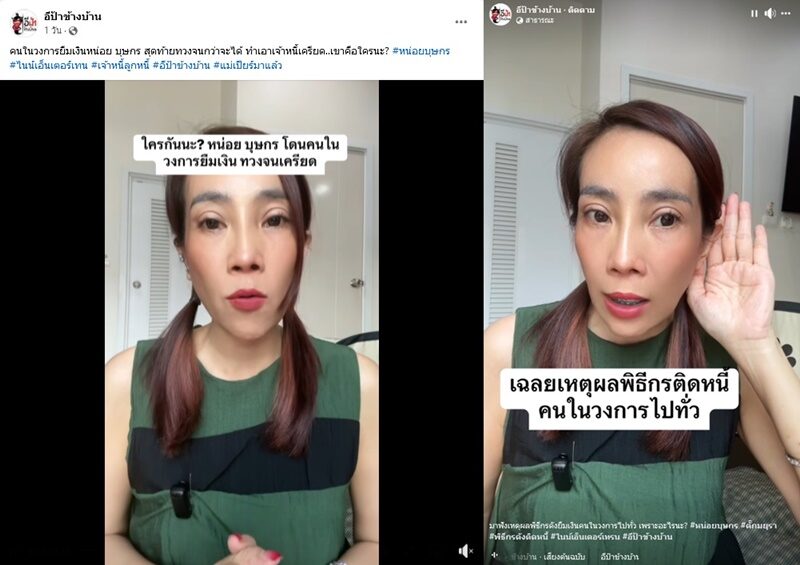 ล่าสุด เพจ อีป้าข้างบ้าน โพสต์คลิปบอกใบ้ “คนในวงการยืมเงินหน่อย บุษกร สุดท้ายทวงจนกว่าจะได้ ทำเอาเจ้าหนี้เครียด..เขาคือใครนะ? #หน่อยบุษกร #ไนน์เอ็นเตอร์เทน #เจ้าหนี้ลูกหนี้ #อีป้าข้างบ้าน #แม่เปียร์มาแล้ว”