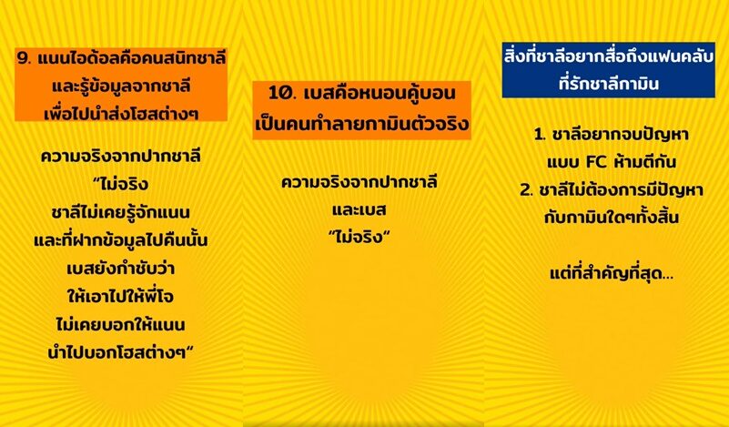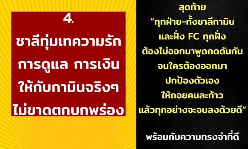 “สุดท้าย ทุกฝ่าย ทั้งชาลี กามิน และฝั่ง FC ทุกฝั่ง ต้องไม่ออกมาพูดกดดันกัน จนใครต้องออกมาปกป้องตัวเอง ให้ถอยคนละก้าว แล้วทุกอย่างจะจบลงด้วยดี พร้อมกับความทรงจำที่ดี”