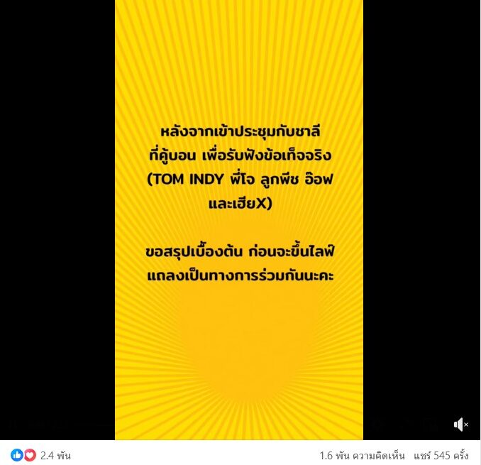 โดยในคลิปได้สรุประบุข้อความว่า “หลังจากเข้าประชุมกับชาลีที่คู้บอน เพื่อรับฟังข้อเท็จจริง (TOM INDY พี่โจ ลูกพีช อ๊อฟ และ เฮียX) ขอสรุปเบื้องต้น ก่อนจะขึ้นไลฟ์ แถลงเป็นทางการร่วมกันนะคะ แก้ความเท็จด้วยความจริงทีละข้อ”