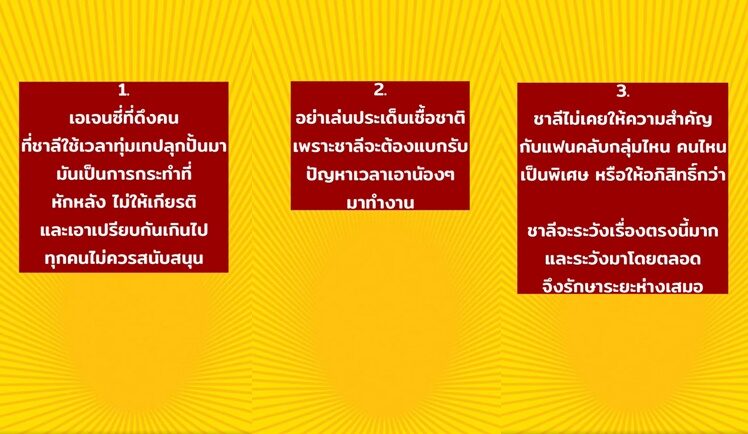 “1.เอเจนซี่ที่ดึงคนที่ชาลีใช้เวลาทุ่มเทปลุกปั้นมา มันเป็นการกระทำที่หักหลัง ไม่ให้เกียรติ และเอาเปรียบกันเกินไป ทุกคนไม่ควรสนับสนุน”