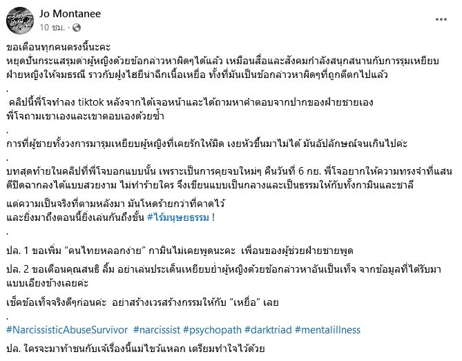 การที่ผู้ชายทั้งวงการมารุมเหยียบผู้หญิงที่เคยรักให้มิด เงยหัวขึ้นมาไม่ได้ มันอัปลักษณ์จนเกินไปค่ะ บทสุดท้ายในคลิปที่พี่โจบอกแบบนั้น เพราะเป็นการคุยจบใหม่ๆ คืนวันที่ 6 ก.ย.