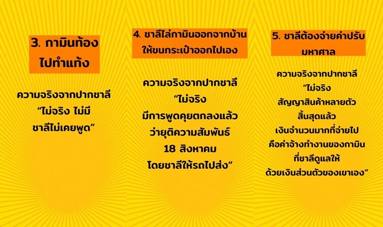 4.ชาลีไล่กามินออกจากบ้าน ให้ขนกระเป๋าออกไปเอง - ความจริงจากปากชาลี “ไม่จริง มีการพูดคุยตกลงแล้วว่ายุติความสัมพันธ์ 18 สิงหาคม โดยชาลีให้รถไปส่ง”