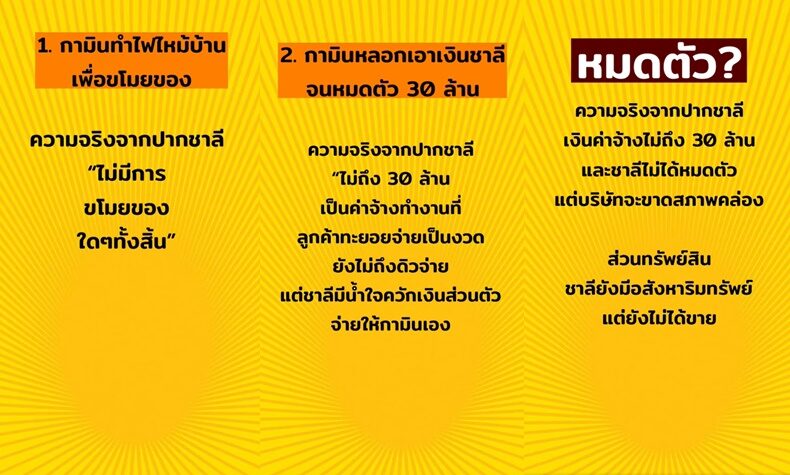 “หมดตัว? - ความจริงจากปากชาลี เงินค่าจ้างไม่ถึง 30 ล้าน และชาลีไม่ได้หมดตัว แต่บริษัทจะขาดสภาพคล่อง ส่วนทรัพย์สินชาลียังมีอสังหาริมทรัพย์ แต่ยังไม่ได้ขาย”