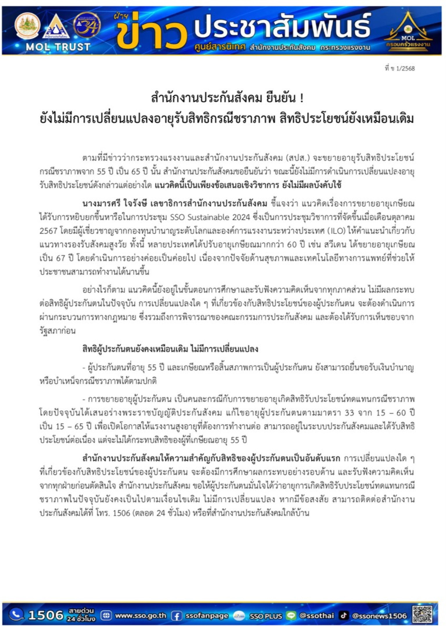 สำนักงานประกันสังคมให้ความสำคัญกับสิทธิของผู้ประกันตน การเปลี่ยนแปลงใดๆจะต้องผ่านกระบวนการพิจารณาทางกฎหมายและรับฟังความคิดเห็นก่อนเสมอหากมีข้อสงสัย ติดต่อ สายด่วนประกันสังคม 1506 (ตลอด 24 ชั่วโมง) หรือสำนักงานประกันสังคมใกล้บ้าน