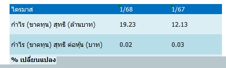 โดยกำไรไตรมาส 1/68 อยู่ที่ 19.23 ล้านบาท เพิ่มขึ้น 58.60% จากช่วงเดียวกันของปีก่อน เนื่องจากรายได้จากการขายและการบริการสําหรับไตรมาส 1/68 มีจํานวน 1,875.21 ล้านบาท เพิ่มขึ้น 113.08 ล้านบาท คิดเป็นร้อยละ 6.42 เมื่อเทียบกับ ช่วงเวลาเดียวกันของปีก่อน จากการเพิ่มขึ้นของรายได้จากผลิตภัณฑ์ Apple และ Multi-band เนื่องจากบริษัทฯมีกิจกรรมส่งเสริมการขายร่วมกับ ผู้จัดจําหน่าย รวมถึงมาตรการกระตุ้นเศรษฐกิจของภาครัฐสําหรับโครงการ “Easy E-Receipt 2.0”