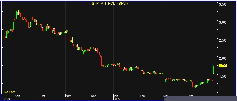 ผู้สื่อข่าวรายงานว่า วันนี้(7พ.ค.68) ราคาหุ้นบริษัท เอส พี วี ไอ จำกัด (มหาชน) หรือ SPVI ณ เวลา 15:55 น. อยู่ที่ระดับ 1.79 บาท บวก 0.41 บาท หรือ 19.71% ราคาสูงสุด 1.79 บาท ราคาต่ำสุด 1.56 บาท ด้วยมูลค่าซื้อขาย 8.16 ล้านบาท โดยราคาหุ้นปรับตัวแรงสูงสุดของวัน(Ceiling) ที่ระดับ 1.79 บาท