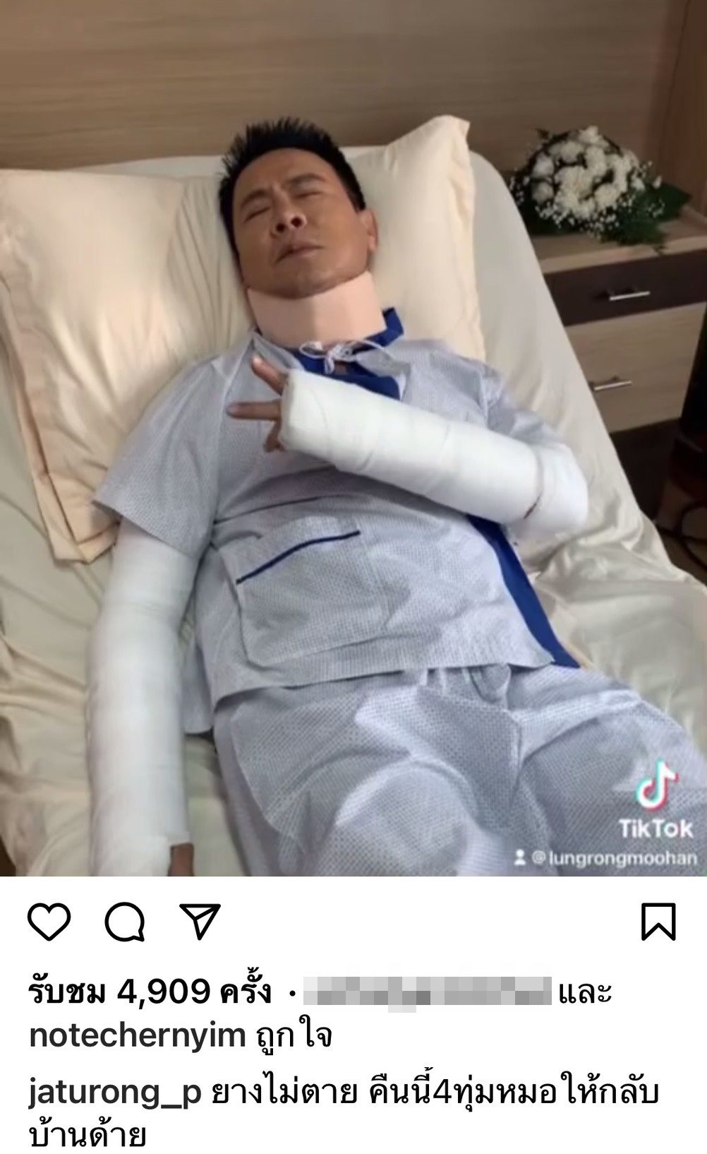 อยู่ๆโพสต์รูปกำลังนอนอยู่เตียงผู้ป่วย แถมยังใส่เฝือกแขนทั้งสองข้าง ดามคอด้วยเฝือกอ่อน ไม่เท่านั้น จตุรงค์ โพธาราม ยังเขียนแคปชั่นบอกอีกว่า "ยางไม่ตาย คืนนี้4ทุ่มหมอให้กลับบ้านด้าย"