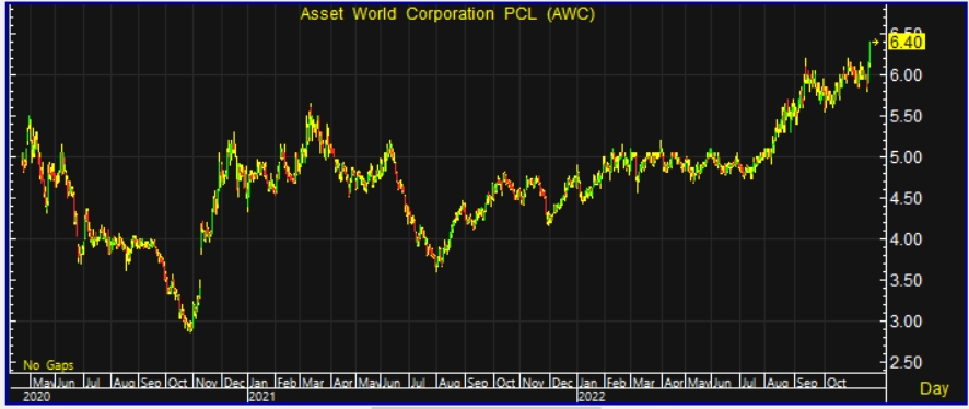 ผู้สื่อข่าวรายงานว่า วันนี้(22พ.ย.65) ราคาหุ้นบริษัท แอสเสท เวิรด์ คอร์ป จำกัด (มหาชน) หรือ AWC ณ เวลา 15:52 น. อยู่ที่ระดับ 6.40 บาท บวก 0.25 บาท หรือ 4.07% ราคาสูงสุด 6.40 บาท ราคาต่ำสุด 6.10 บาท ด้วยมูลค่าซื้อขาย 503.78 ล้านบาท โดยราคาหุ้นนิวไฮรอบ 3 ปี โดยนับตั้งแต่หุ้นยืนที่ระดับ 6.55 บาท เมื่อวันที่ 18 ต.ค.62