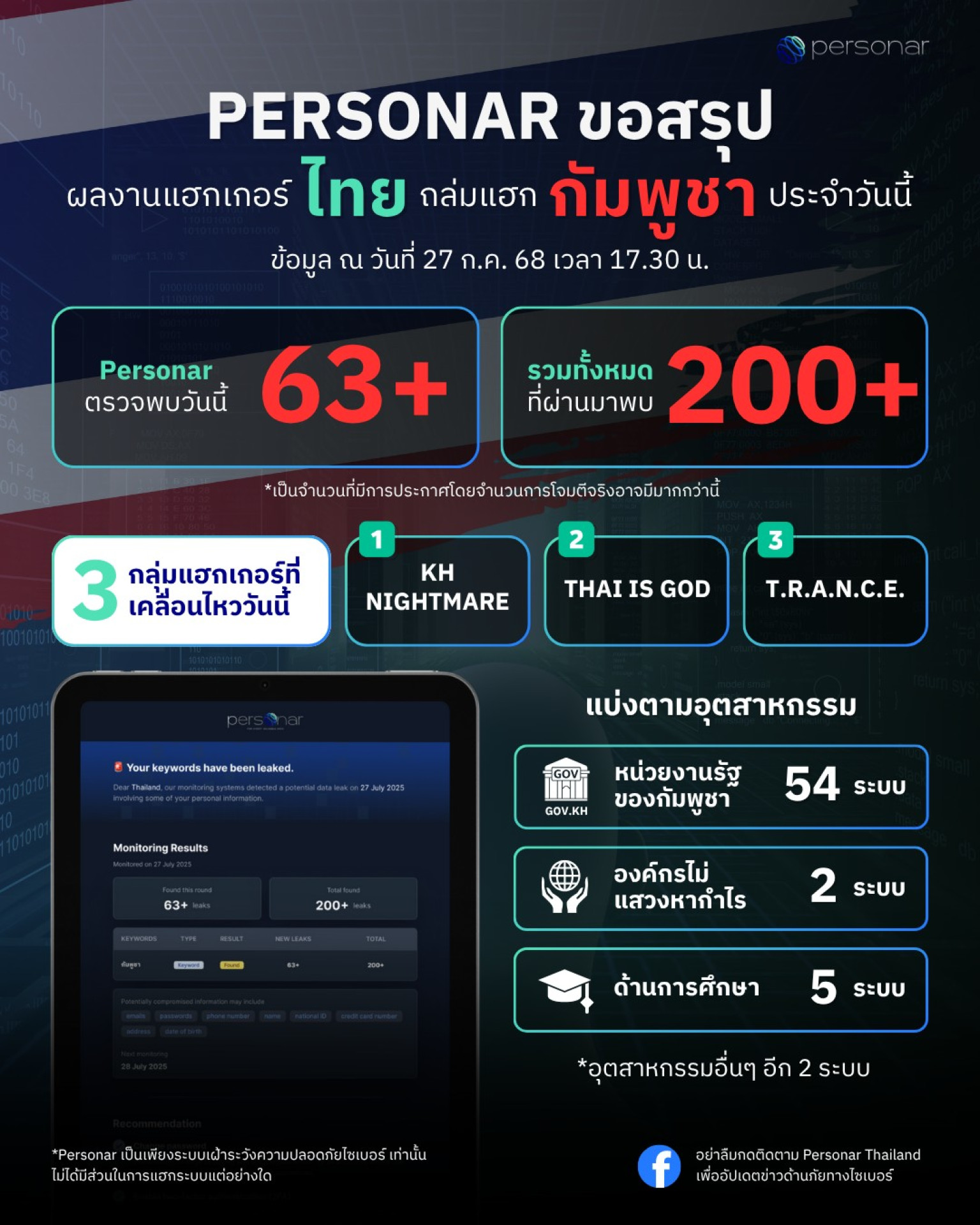 วันที่ 27 ก.ค.68 เพจ Personar Thailand บริษัทด้านเทคโนโลยีสารสนเทศ โพสต์ข้อความระบุว่า "สรุปตัวเลขการแฮกจากฝั่งไทย ณ วันที่ 27 ก.ค. 2568 เวลา 17.30 น. มีการเคลื่อนไหวจากแฮกเกอร์ฝั่งไทยจำนวน 3 กลุ่มหลัก ซึ่งสามารถเจาะระบบของกัมพูชาได้มากกว่า 63 ระบบภายในวันเดียว"