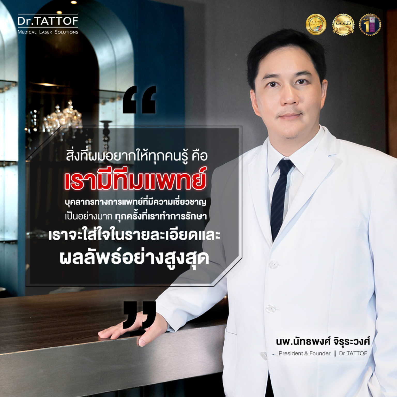 ผมเชื่อว่า…นวัตกรรมเลเซอร์ ไม่ควรถูกมองว่าเป็นเพียงเครื่องมือ แต่มันคือ “ศาสตร์” ที่ต้องใช้ความรู้ ความเข้าใจ และความเชี่ยวชาญอย่างแท้จริง – นพ.นัทธพงศ์ จิรุระวงศ์ ประธานบริษัทและผู้ก่อตั้ง Dr.TATTOF
