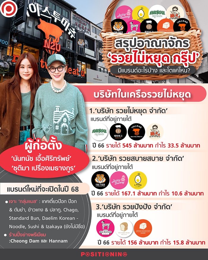 1.‘บริษัท รวยไม่หยุด จำกัด’ ดูแลธุรกิจร้านอาหาร แบรนด์ที่อยู่ภายใต้ ได้แก่ nice 2 Meat u ร้านปิ้งย่างสไตล์เกาหลีระดับพรีเมียม 14 สาขา, Happy Pig ร้านปิ้งย่างสไตล์เกาหลี 3 สาขา, เกศเตี๋ยว 1 สาขา และหมูกระทะคนรวย (อยู่ในระหว่างรีแบรนด์และย้ายโลเกชั่นใหม่)