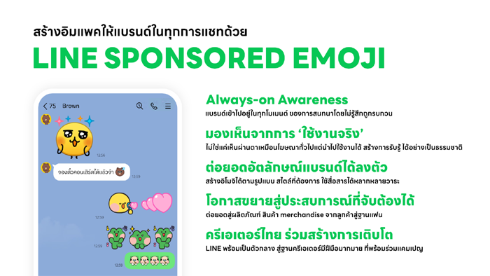 • หลากหลายครีเอเตอร์ไทย ร่วมสร้างแคมเปญเติบโต โดย LINE พร้อมทำหน้าที่เป็นตัวกลางช่วยเชื่อมโยงแบรนด์เข้ากับครีเอเตอร์ไทยที่มีศักยภาพและฐานแฟนเฉพาะตัวในตลาดคาแรกเตอร์ ให้แบรนด์ร่วมพัฒนา Sponsored Emoji เพื่อสร้างการรับรู้ การมีส่วนร่วม และต่อยอดแคมเปญการตลาดได้ทัชใจ ตัวอย่างครีเตอร์ไทยชื่อดัง เช่น Bear Please, Salmon Cat & Minimal G, Munin & Mr.Whale, Dueb Dueb, Onnie Bear, Hyperrabbit, FAHFAHS และ COCO