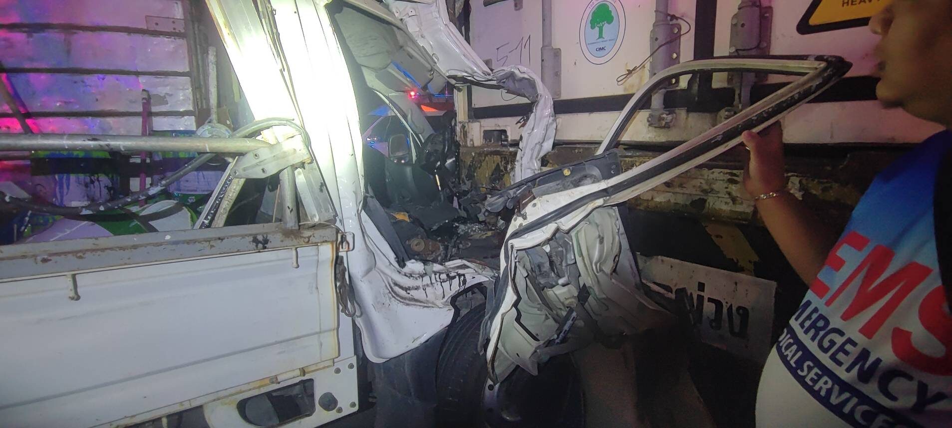 ที่เกิดเหตุ เจ้าหน้าที่มูลนิธิร่วมกตัญญูและกู้ภัยทางหลวงพบรถบรรทุก 4 ล้อเล็ก ทะเบียนกทม. สภาพด้านหน้าพังยับเยินชนอัดติดกับท้ายรถเทรลเลอร์นายก้องเกียรติ (สงวนนามสกุล) อายุ 33 ปี คนขับรถ บาดเจ็บสาหัสและถูกอัดก๊อปปี้ติดอยู่ภายในห้องโดยสาร เจ้าหน้าที่ต้องใช้ เครื่องตัดถ่าง นานกว่าครึ่งชั่วโมงเพื่อนำร่างออกมา ก่อนเร่งส่ง รพ.คลองหลวง