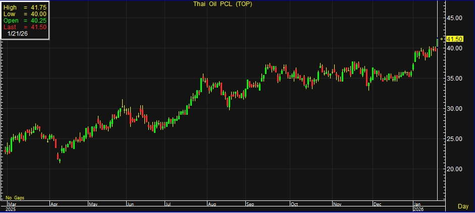 ผู้สื่อข่าวรายงานว่า วันนี้ (21 ม.ค.69) ราคาหุ้นบริษัท ไทยออยล์ จำกัด (มหาชน) หรือ TOP ณ เวลา 11:16 น. อยู่ที่ระดับ 41.50 บาท บวก 2 บาท หรือ 5.06% สูงสุดที่ระดับ 41.75 บาท ต่ำสุดที่ระดับ 40 บาท ด้วยมูลค่าการซื้อขาย 610.70 ล้านบาท
