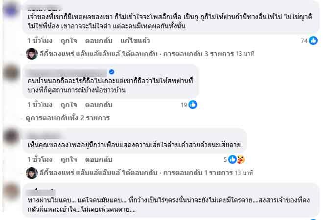 บางความคิดเห็นระบุว่า ทางผ่านไม่แคบ… แต่ใจคนมันแคบ… ที่กว้างเป็นไร่ๆตรงนั้นน่าจะยังไม่เคยมีใครตาย….สงสารเจ้าของที่คงกลัวผีแหละเข้าใจ…ไม่เคยเห็นคนตาย….เป็นต้น