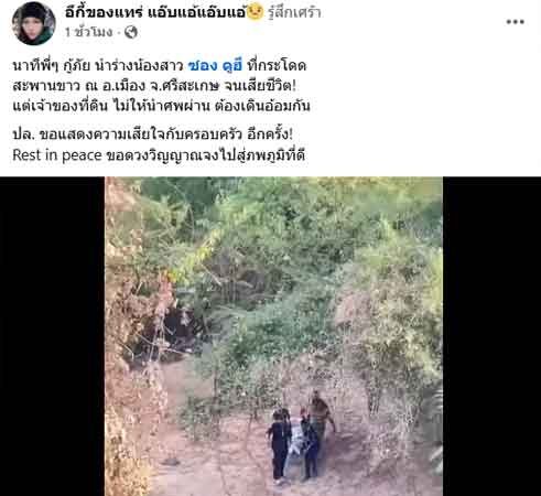 โดยเพจอีกี้ของแทร่ แอ๊บแอ้แอ๊บแอ้ ได้นำคลิปเหตุการมาเผยแพร่พร้อมระบุข้อความว่า นาทีพี่ๆ กู้ภัย นำร่างน้องสาว ซอง ดูฮี ที่เสียชีวิต! แต่เจ้าของที่ดิน ไม่ให้นำศพผ่าน ต้องเดินอ้อมกัน ปล. ขอแสดงความเสียใจกับครอบครัว อีกครั้ง! Rest in peace ขอดวงวิญญาณจงไปสู่ภพภูมิที่ดี