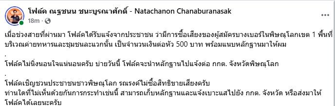 วันที่ 5 ก.พ.2569 "โฟล์ค" นายณฐชนน ชนะบูรณาศักดิ์ ผู้สมัคร สส.พรรคประชาชน พิษณุโลก เขต 1 โพสต์ข้อความระบุว่า เมื่อช่วงสายที่ผ่านมา โฟล์คได้รับแจ้งจากประชาชน ว่ามีการซื้อเสียงของผู้สมัครบางเบอร์ในพิษณุโลกเขต 1 พื้นที่บริเวณค่ายทหารและชุมชนละแวกนั้น เป็นจำนวนเงินต่อหัว 500 บาท พร้อมแนบหลักฐานมาให้ผม
