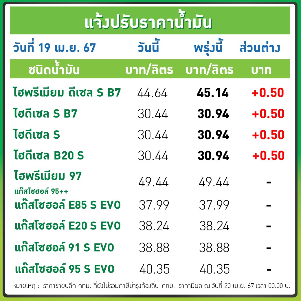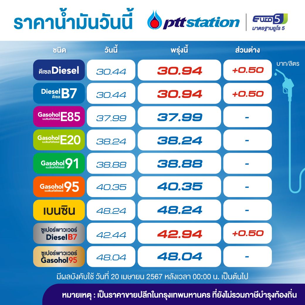 วันที่ 19 เมษายน 2567 PTT Station ปรับราคาขายปลีกน้ำมันกลุ่มดีเซล เพิ่มขึ้น 0.50 บาท/ลิตร สำหรับกลุ่มเบนซินและแก๊สโซฮอล์ คงเดิม มีผล 20 เม.ย. 2567 เวลา 00.00 น.เป็นต้นไป