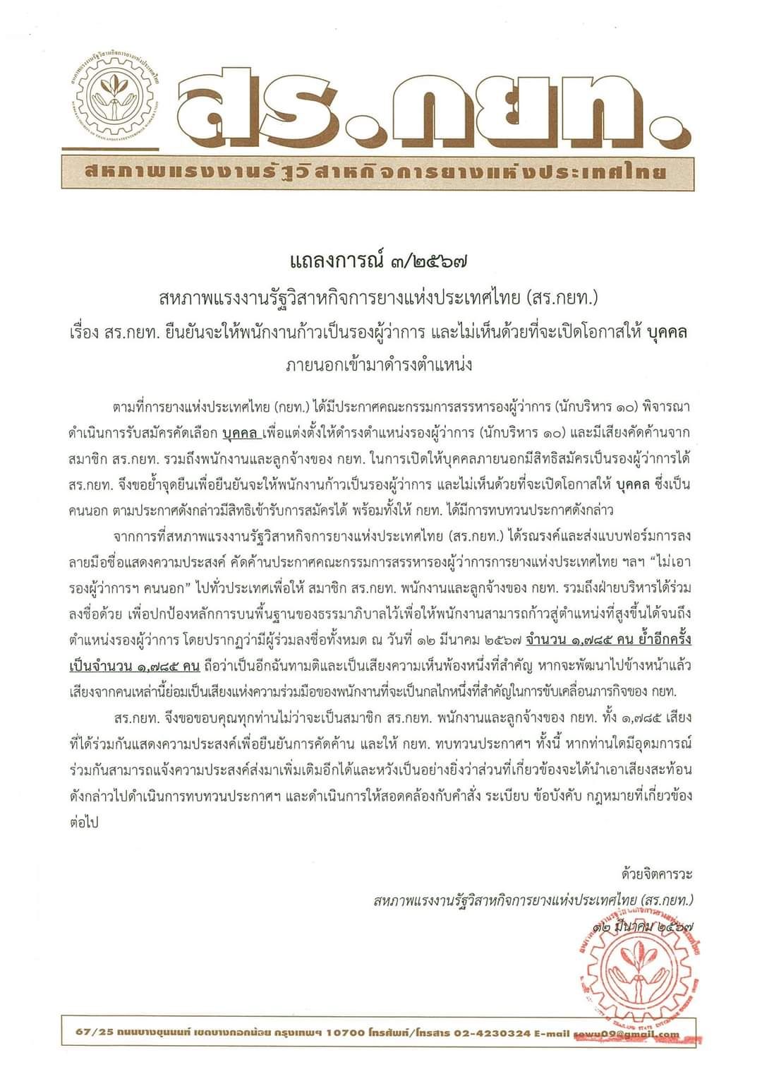 ฉันทามติพนักงานและลูกจ้างของ กยท. 1,785 เสียง ลงชื่อคัดค้าน กยท. ประกาศเปิดทางตั้งคนนอก เป็นรองผู้ว่าการ กยท.