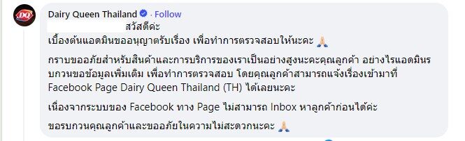 ต่อมา Dairy Queen Thailand เข้ามาคอมเมนต์ชี้แจงในโพสต์ดังกล่าว ความว่า สวัสดีค่ะ เบื้องต้นแอดมินขออนุญาตรับเรื่อง เพื่อทำการตรวจสอบให้นะคะ
