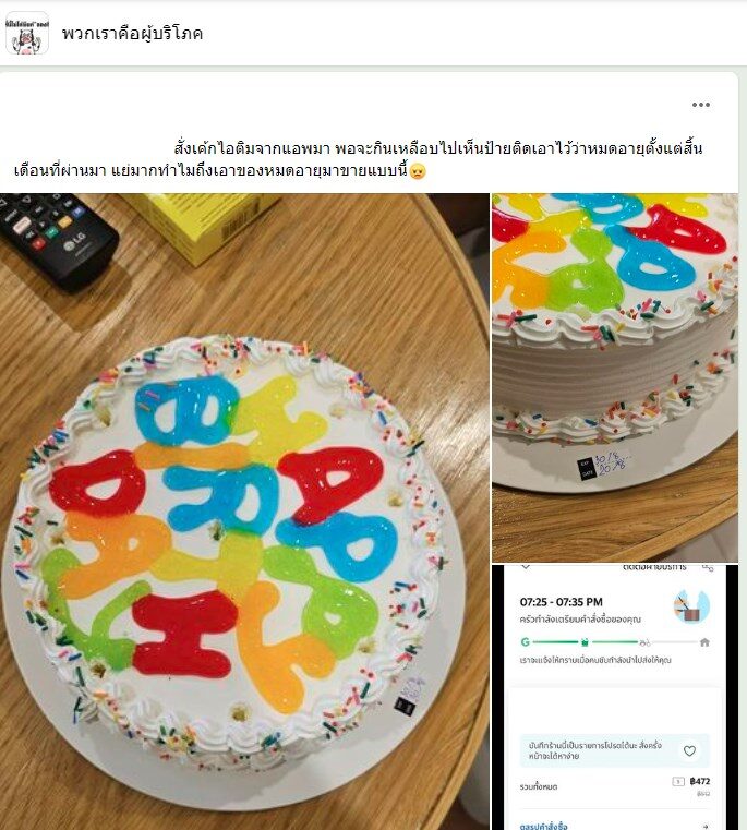 หญิงสาวรายหนึ่ง โพสต์ข้อความผ่านทางเฟซบุ๊ก ลงกลุ่ม พวกเราคือผู้บริโภค หลังสั่งเค้กมาแล้วพบว่า ร้านนำเค้กหมดอายุมาส่งให้ ความว่า สั่งเค้กไอศกรีมจากแอพมา พอจะกินเหลือบไปเห็นป้ายติดเอาไว้ว่าหมดอายุตั้งแต่สิ้นเดือนที่ผ่านมา แย่มากทำไมถึงเอาของหมดอายุมาขายแบบนี้