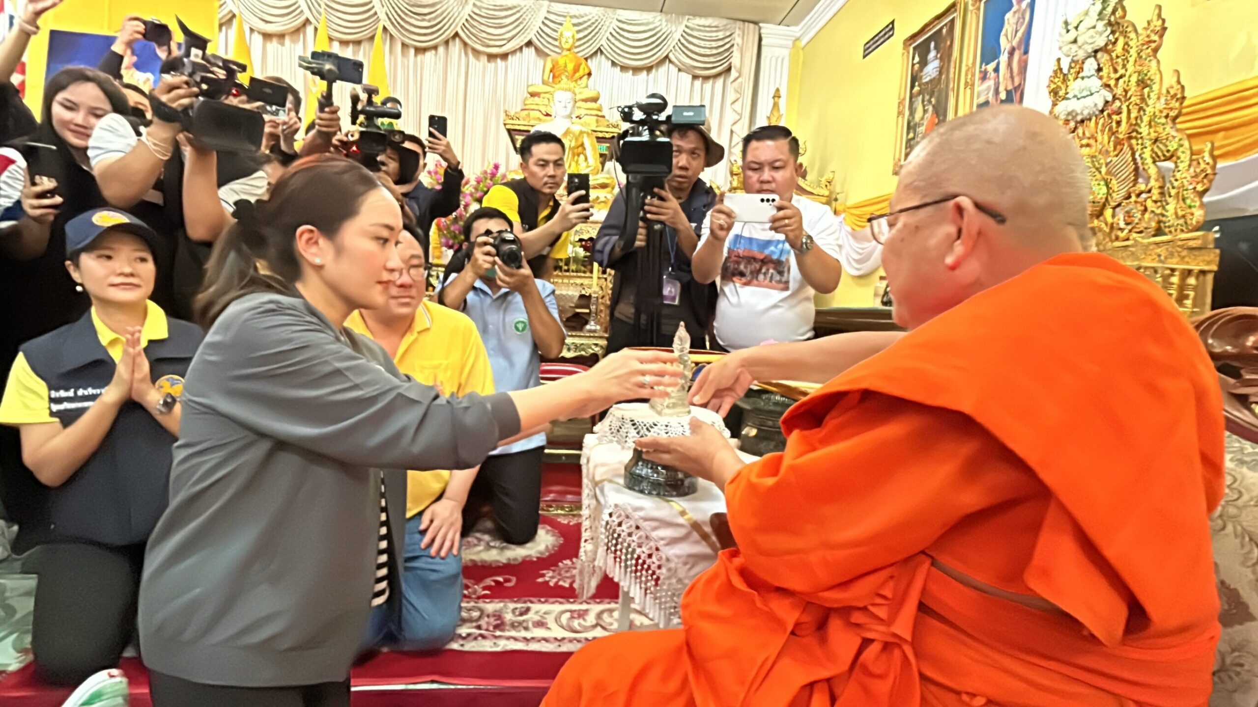 ก่อนที่นายกรัฐมนตรีจะทำความเคารพพระบรมสาทิศลักษณ์พระบาทสมเด็จพระเจ้าอยู่หัว ก่อนกราบพระประธาน จากนั้นนายกรัฐมนตรี กราบนมัสการ พระครูรัตนชัยธรรม ที่ปรึกษาเจ้าคณะตำบลหนองหอยและเจ้าอาวาสวัดเมืองศาตรหลวง โดยเจ้าอาวาสได้มอบพระแก้วขาวจำลอง หน้าตัก 3 นิ้ว และได้มอบภาพถ่ายนายทักษิณ ชินวัตร อดีตนายกรัฐมนตรี ถ่ายเมื่อปี พ.ศ.2542 ให้กับนายกฯ