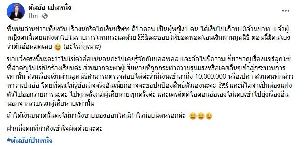 อ่านข่าวต้นฉบับได้ที่ : ต้นอ้อ เป็นหนึ่ง โพสต์ทันที หลังโดนโยง นักร้องเรียนสาว รีดเงิน ดิไอคอน 10 ล้าน