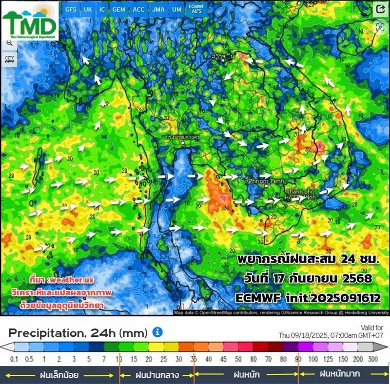 วันที่ 17 ก.ย.2568 กรมอุตุนิยมวิทยา อัปเดตผลการพยากรณ์ฝนสะสมรายวัน (ทุกๆ 24 ชม.:(นับตั้งแต่เวลา 07.00 น. ถึงเวลา 07.00 น.วันรุ่งขึ้น) และลมที่ระดับ 925hPa (750 ม.)15 วันล่วงหน้า ระหว่าง 17 ก.ย.-1 ต.ค.68 init. 2025091612 จากแบบจำลองของศูนย์พยากรณ์อากาศระยะกลางยุโรป (ECMWF) : วิเคราะห์ตามผลจากแบบจำลองฯ เฉดสีแดงหมายถึงฝนหนัก สีเขียวหมายถึงฝนเล็กน้อย :